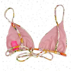Darling tangerine floral print on a soft powder pink. Unlined top and strings have cute little branded golden metal caps for some extra pizazz.