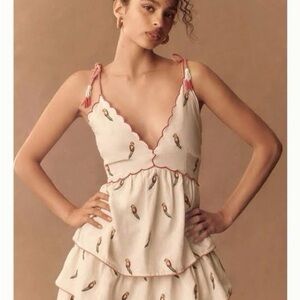 This elegant cream sleeveless dress features delicate embroidery and a flattering silhouette. Perfect for any occasion, it combines style and comfort effortlessly.