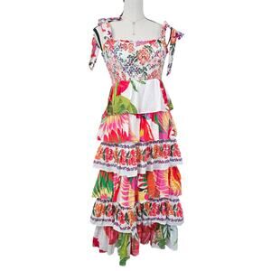 Farm Rio Tropical Floral Tiered Midi Dress Sz S Smocked Ruffle Boho QuietLuxury