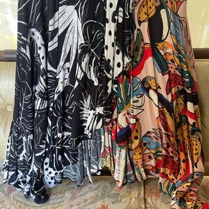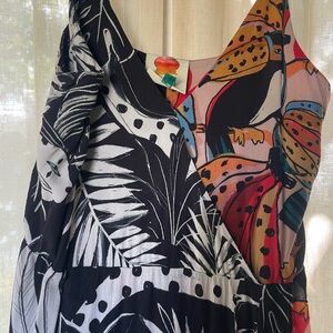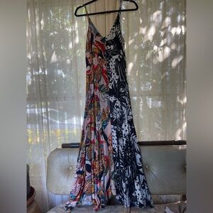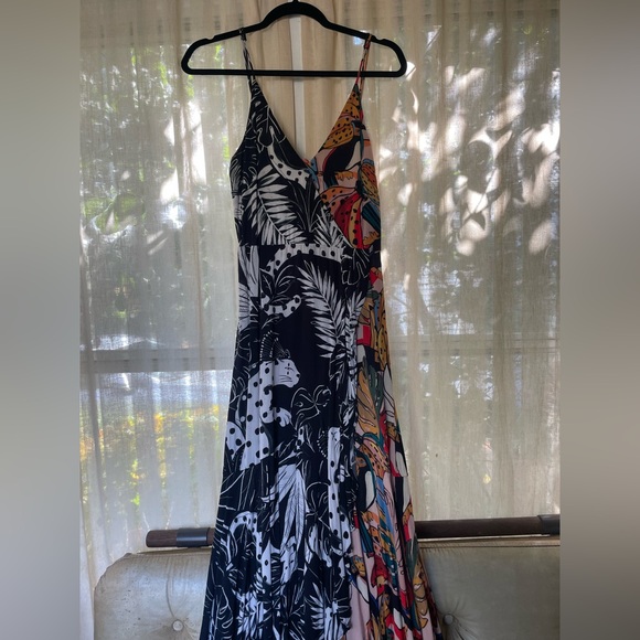 Farm Rio Party or Wedding Guest Dress Embrace vibrant style with this signature Farm Rio patterned tropical maxi dress. This dress features a stunning mix of black and multicolor patterns. Side zip, size Small. Ideal for smaller busts. Adjustable straps. High low bottom seen in picture.