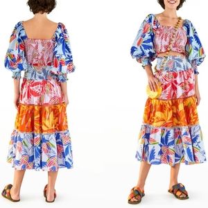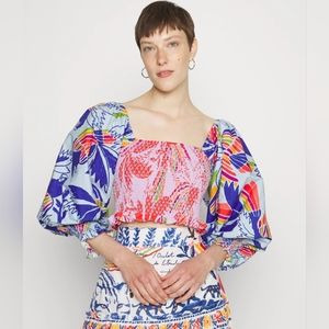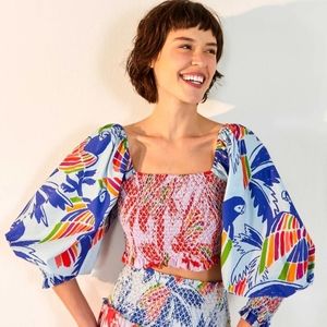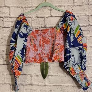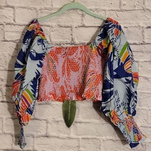 Square back, smocked bodice and cuffs, tropical print, cropped length
