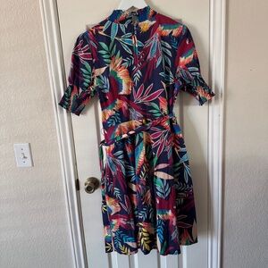 Color: Multicolor (navy base with red, green, yellow, and coral accents , parrots print)