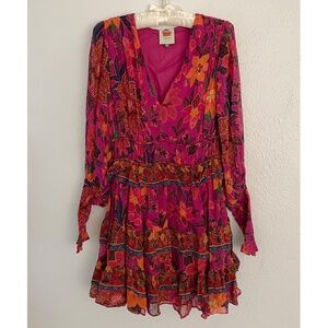 Farm Rio Tropical Tapestry Long-Sleeve Tiered Mini Dress Boho Small