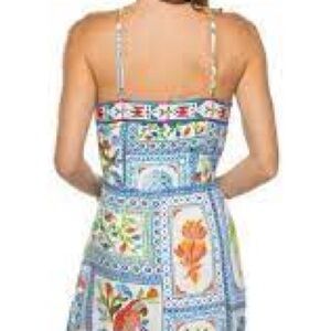 Tropical tiles pattern with birds, tropical leafs an palm trees White background with vibrant colors of shades of blue, orange, brown,green and red. Adjustable spaghetti straps Look of a wrap but sewn at waist 15” waist (before stretch/ pull ties) 36” shoulder to hem