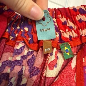 Bright reddish pink farm rio pants with a playful fish pattern in blue and cream. Perfect for a bold statement look. Very comfortable with an elastic waist. These were purchased in Brazil from Farm Rio and are a size pp which is the equivalent of extra small. I am typically a size medium but these fit very well.