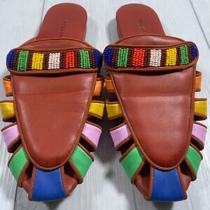 Farm Rio Women's 8 Rainbow Beaded Brown Leather Mule Rust Sandal Boho Vacation