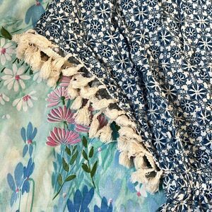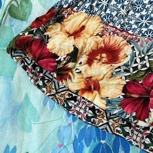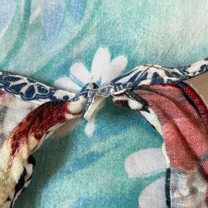 Adorable Hawaiian flower trimmed with cotton tassels on the sleeves. Size tag was cut out waist stretch’s to 20” I would guess a size Medium for a comfortable fit but please SEE MEASUREMENTS. The buttonhole ring is loose but still there and moderately attached. Content tag is also cut out.