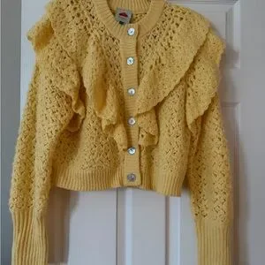 Farm Rio Soft yellow ruffle knit cardigan with button front. feminine, cozy look. Versatile layering piece that adds warmth and style to outfits.