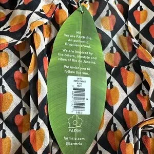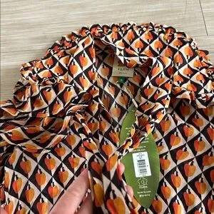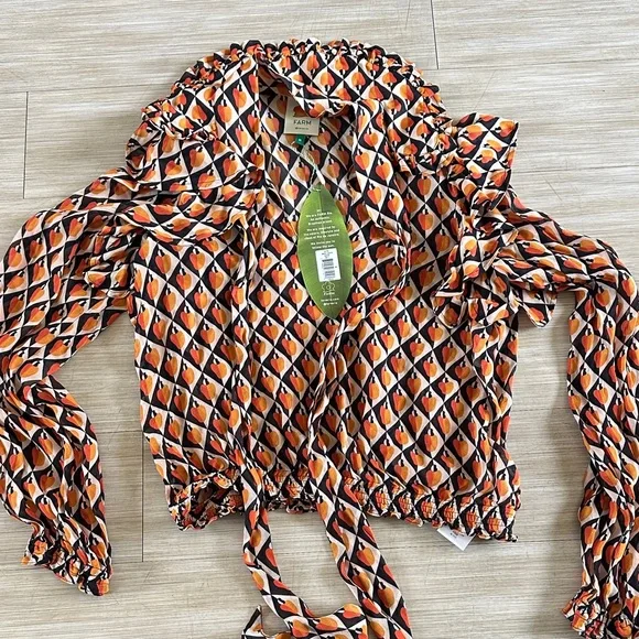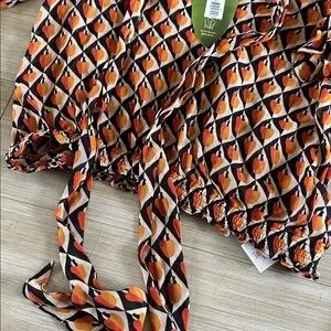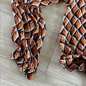 Viscose top. Tie at neck, long. Elastic cuffs and waist. Never worn