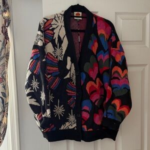 Vibrant cardigan with a bold, multicolor pattern. Features a button-up front and cozy design.