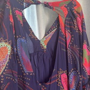 Beautiful maxi dress. Very flattering for any body type. Has an open back. The elastic around the back button broke so I had to mend it as best I could. I will adjust price according to that issue.