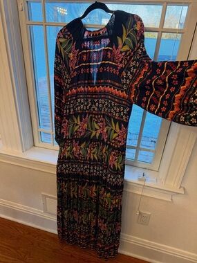Long sleeve maxi dress, tie at neck with bead tassel, balloon sleeves
