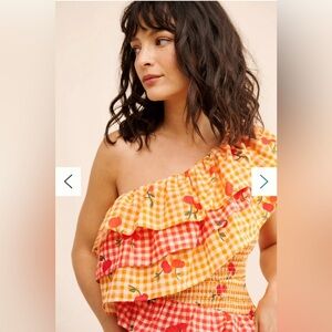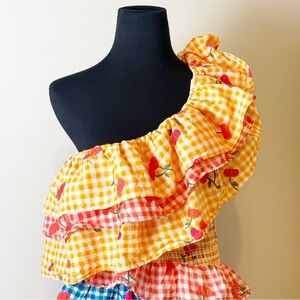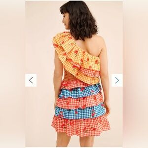 Keywords: Farm Rio, Anthropologie, Cherry Dress, Gingham Dress, Ruffle Dress, One Shoulder Dress, Mini Dress, Summer Dress, Party Dress, Casual Dress, Vacation Dress, Smocked Dress, Tiered Dress, Asymmetric Dress