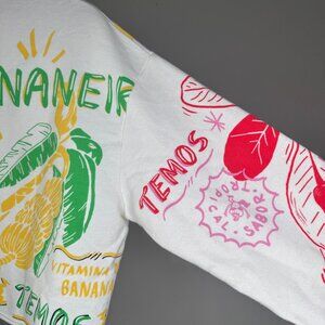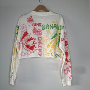 Original design of Farm Rio in Rio, never worn. Cropped sweater with unifinished hem. Fun banananeira, caju colorful print