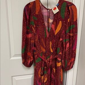 Stylish dress with a multicolor pattern. Features a unique design and vibrant colors. Size medium great condition