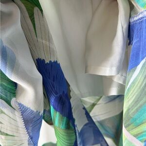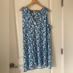 Features a print with blue parrots and green leaves on a white background all throughout the dress. The dress has lining that goes to the mid-thigh area. Straps are NOT adjustable