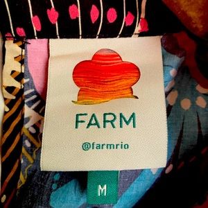Like- new condition Farm Rio blouse. Quarter- length sleeves with puffy shoulders. High neck with beaded buttons in back. She’ll print.