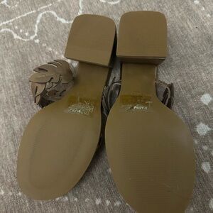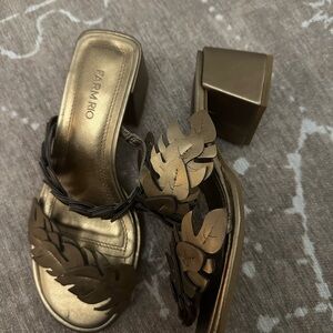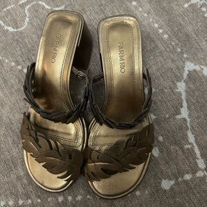 Elegant gold mules with intricate leaf detailing. Perfect for adding a touch of luxury to any outfit.
