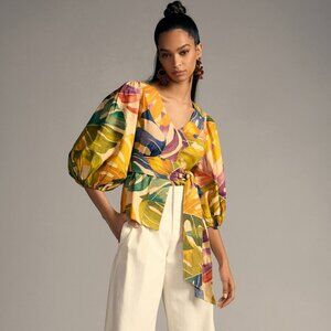 Farm Rio x Anthropologie Colorful Belted Puff Statement Sleeve Wrap Blouse
