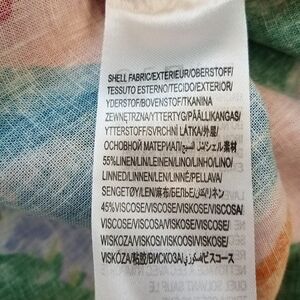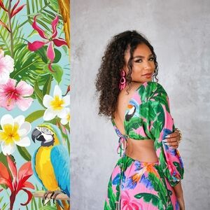 Farm Rio x Anthropologie Printed V-Neck Cutout Dress, tropical floral tucan print, elastic waist, back tie, deep v-neck, pockets, side zipper, 55% linen/45% viscose, size small.