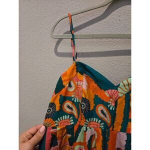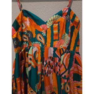 Keywords: Farm Rio, pleated dress, midi dress, multicolor, summer dress, tropical theme, sleeveless, adjustable straps, cotton dress, women's fashion, pullover dress, garden party, beach brunch, casual evening, pre-owned.
