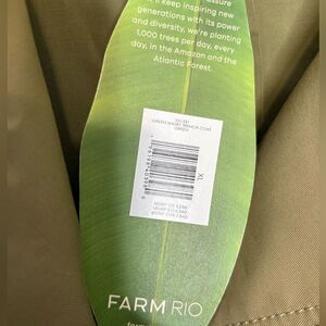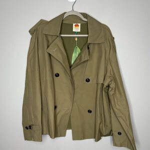 Size XL. This short trench coat from Farm Rio highlights refined details including a spread collar, shoulder epaulets, and buttoned strap cuffs. A double-breasted front button closure completes this design. Comes with extra button and thread.