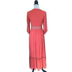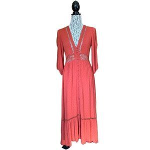 Rust-colored, long-sleeve midi dress with a bohemian flair. Made of lightweight, textured viscose with a subtle dotted pattern. Features a deep V-neckline, fabric-covered buttons down the front, and decorative lace insets along the neckline, waist, sleeves, and hem. Slightly puffed sleeves with open shoulders and additional lace detail. The skirt is gathered at the waist and flows into a tiered maxi-length hem with lace trim. Half-slip lined.