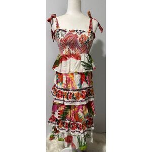 Farm Rio Tropical print tiered Ruched tie shoulder dress XS
