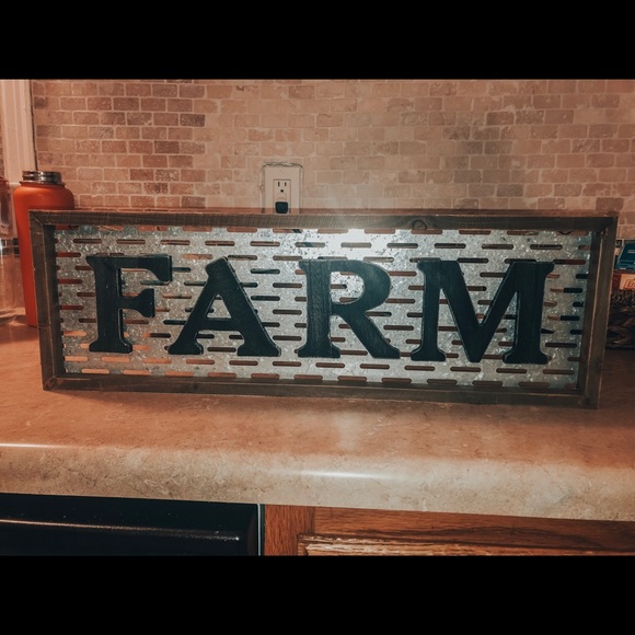 Wooden/ Tin farm sign. Perfect for farmhouse decor. 24x8in. Burlap string on the back for hanging. In perfect condition!