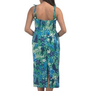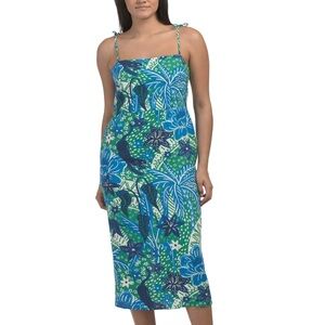 Vibrant tropical print midi dress in blue and green. Features a sleeveless design with adjustable straps.