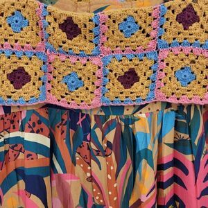 Farm Rio Anthropologie Dress Crochet Tiered Ruffle Midi Colorful Tiger Tropic L
