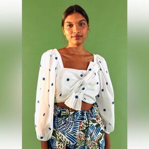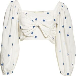 Size XL. Embroidered flowers bring a splash of color to a three-quarter sleeve crop top fashioned with a front tie for on-trend appeal.