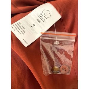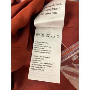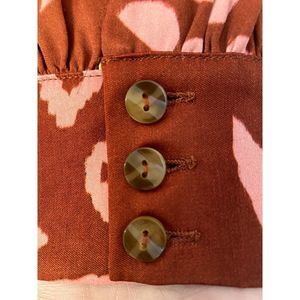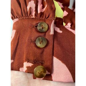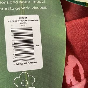 Farm Rio Toucanissimo Wrap Dress. Beautiful Burgundy Color. This is NWT and it is gorgeous! I did notice it has a loose button on the sleeve, please see the last photo. This can be easily sewn, did not notice when purchasing. There also appears to be a missing string of beading on the end of the belt tie. Noticed when posting.