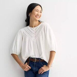 Bring effortless charm to your wardrobe with this Farmers Market Women’s Top in Size XL. Crafted from 100% breathable cotton, this lightweight blouse features delicate lace trim, pintuck pleats, and fabric-covered buttons at the neckline for a touch of boho-inspired elegance. The airy, relaxed silhouette is fully lined for comfort and coverage, while the ¾-length puff sleeves with elastic cuffs add a timeless, feminine finish.