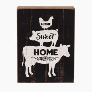 NEW! Home Sweet Home Farm Animal Stack Box Sign is a decorative wooden sign with farmhouse style. The sign sits vertically on a freestanding base for stable display on a flat surface. The box sign features a black painted background with a distressed finish, and depicts the silhouettes of a cow, pig, and chicken arranged in a stack. The sign reads, "home sweet home." Measures 8" high by 6" wide by 1.5" deep.