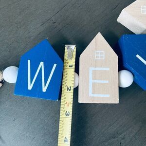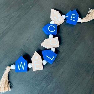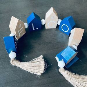 NWT boho farmhouse modern solid wooden letter block “Welcome” bead garland decor sign. Blue, white and natural light wood tones with twine tassel at both ends.