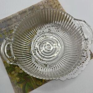Farmhouse Clear Glass Candy Dish Bowl Side Handles 2 Earth Tone Spools of Thread