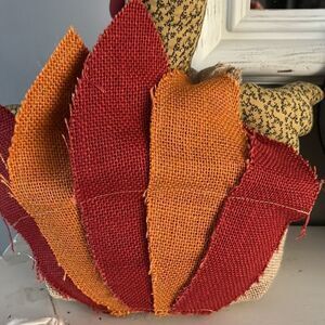 Turkey has various fabrics including twine/cording, cotton/polyester, felt, and colorful burlap. The body of the Turkey is stuffed with filler to provide bulk. Also rice or sand was added to the interior to provide weight to the Turkey.