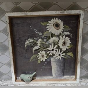 Framed floral wall art featuring a bouquet of white sunflowers in a gray vase. Muted green leaves and soft cream accents. Rustic whitewashed frame.