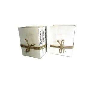 Bring a touch of rustic charm to your home with this set of 2 farmhouse-style faux book stacks. Each stack is wrapped in natural jute twine and painted in a distressed white finish for a cozy, vintage-inspired look. Perfect for shelf styling, tiered trays, entry tables, or mantel displays.