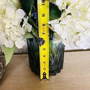 NWT beautiful farmhouse floral greenery flower centerpiece arrangement in clear blue glass geometric textured vase. With eucalyptus stems, lavender, blueberries, hydrangeas, etc. see photos for size.