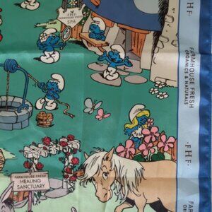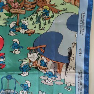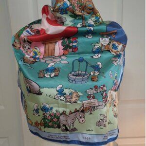 Adorable Smurf 21-in x 21-in scarf. The Smurfs are having a relaxing and calming day with their animal friends depicted on this 2023 scarf. Machine washable. EUC