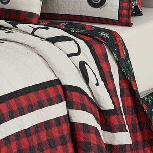 NEW in package! BACK IN STOCK!! Old Red Truck ALL ROADS LEAD HOME AT CHRISTMAS Printed QUEEN or KING Quilt Set. Includes the QUEEN quilt 90x90 inches and two standard size pillow shams. KING set includes the quilt 105x95 inches and two kins size pillow shams. (Extra throw pillows are not included) Reversible to a Black base with red trucks! Made of soft polyester microfiber that is machine washable and low temp dry. Once these are sold, they will not be restocked before Christmas.