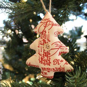 Pillow Christmas Tree with wooden button and twine loop hanger in excellent condition.