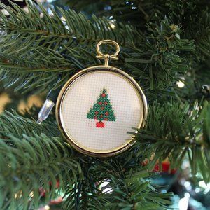 Vintage, handmade cross stitch Christmas tree in frame. *Frame does show some cosmetic wear.