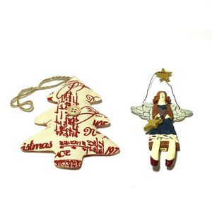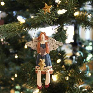 Rustic angel ornament with wire loop hanger accented with a star. Legs and star that angel is holding dangle. Very adorable!