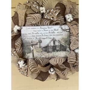 Farmhouse Religious Wreath โ Neutral Amazing Grace Old Rugged Cross Decor