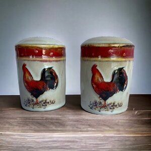Farmhouse Rooster Salt Pepper Ceramic Shaker Set Hand Painted 2 PC