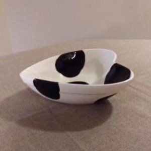 This is a large heart-shaped, ceramic, cow-hide inspired serving bowl. It is a unique Farmhouse Chic style. Use it as a serving bowl, or use it as an accessory. The bowl is 10.5"w X 11.5"d X 3.25"h. It is in like new condition with no chips or cracks.