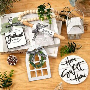 🧿FARMHOUSE TIERED TRAY DECOR SET of 16: Houmury tiered tray decor set will come with set of 16: Lantern*1, Home Sweet Home Sign*1, Cutting Board Gathered Sign*1, Blessed Mini Rolling Pin*1, Cathedral Arch Window*1, Easel*2, Artificial Plant*8, wooden bead garland with tassel. Please note, the tiered tray is not included.